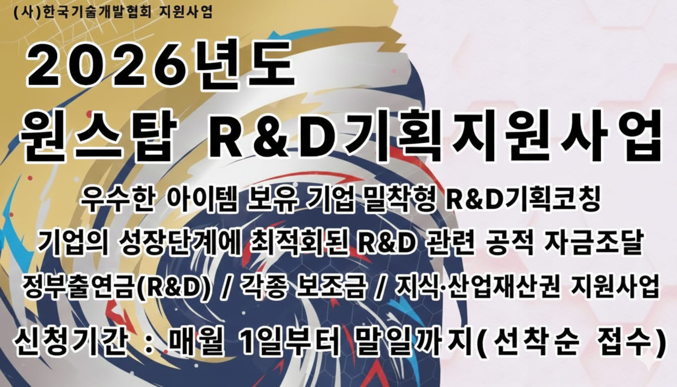 | » | 한국기술개발협회, 2026년도 원스탑 R&D 기획지원사업 공고 | 한국기술개발협 | 2025.12.03 | 2856 |
