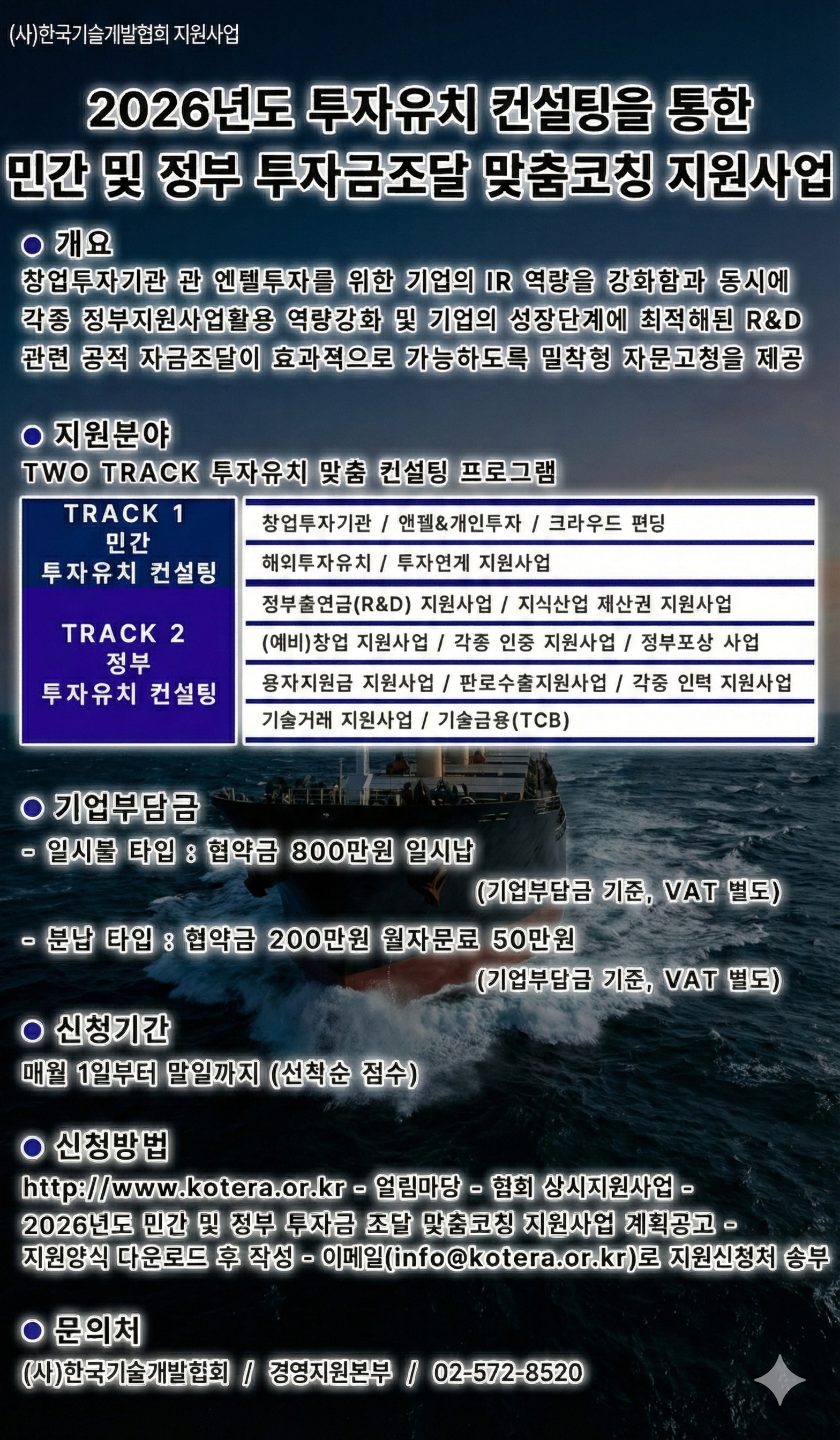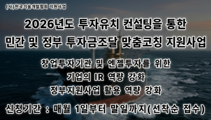 국내 최대 정책자금 커뮤니티 정실미를 공식 후원하고 있는 (사)한국기술개발협회(협회장 최노아)는 ‘2026년도 투자유치 컨설팅을 통한 민간 및 정부 투자금 조달 맞춤코칭지원사업’을 협회 홈페이지를 통해 공고하고 2025년 말까지 선착순 수시접수를 받는다고 공식 발표했다.