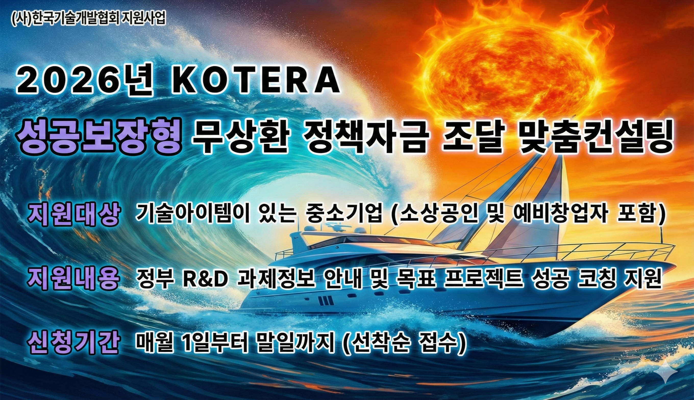 | 106 | 한국기술개발협회, 2026년도 무상환 정부지원금 조달을 위한 기업R&D역량 무상진단 코칭지원사업 공고 | 한국기술개발협 | 2025.12.15 | 1640 |