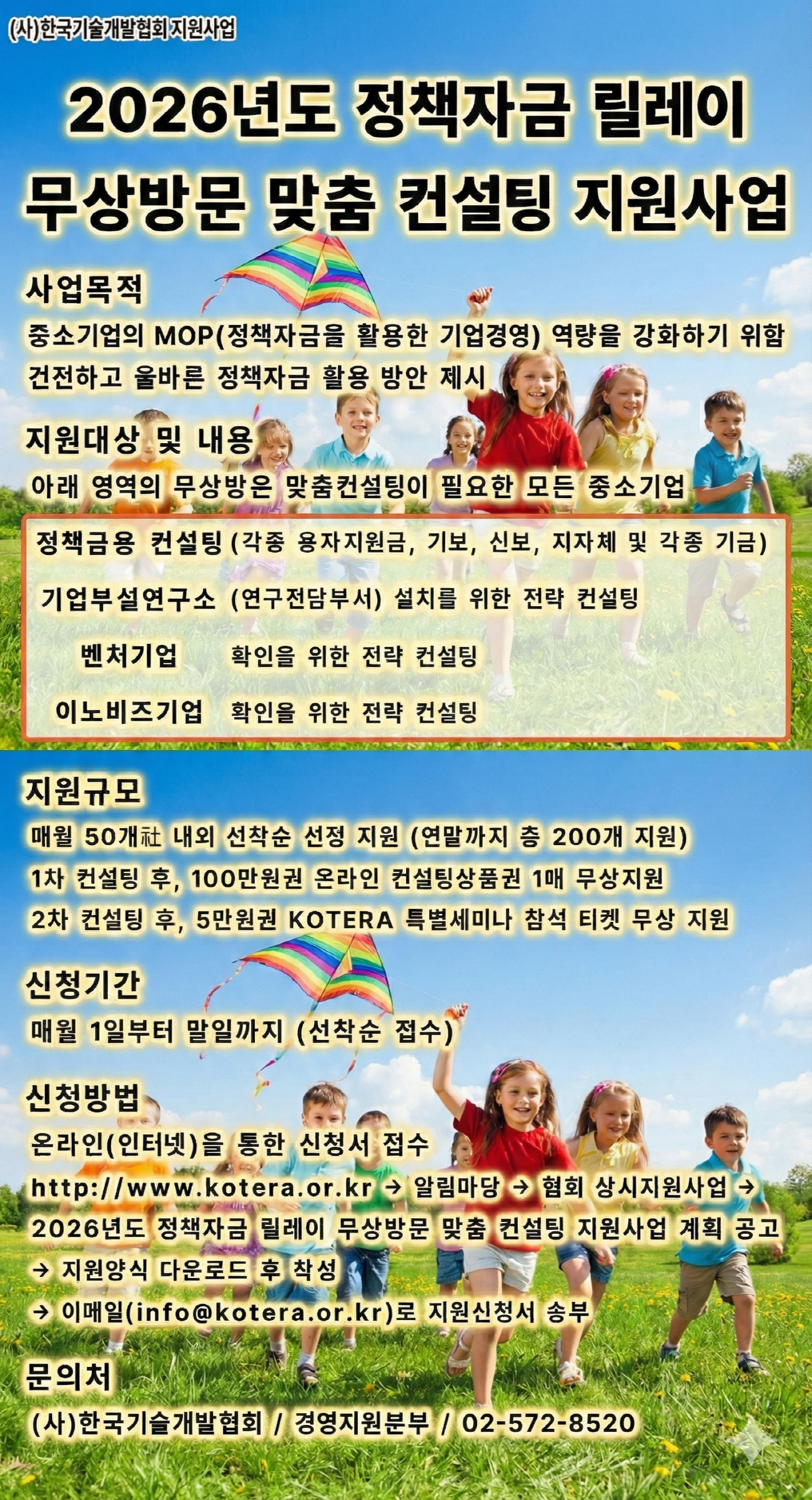 국내 최대 정책자금 커뮤니티 정실미 다음카페를 공식 후원하고 있는 비영리민간단체 (사)한국기술개발협회(협회장 최노아)는 2026년 1월부터 시작되는 ‘2026년도 정책자금 릴레이 무상방문 맞춤컨설팅 지원사업’을 통해 중소기업의 MOP(Management of Policyfund : 정책자금을 활용한 기업경영) 역량을 강화하고 건전하고 올바른 정책자금 활용 방안을 제시하는 전략컨설팅 지원사업을 진행한다고 공식 발표했다.