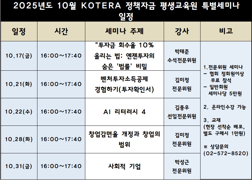 국내 최대 정책자금 커뮤니티 정실미 다음카페를 공식 후원하고 있는 비영리민간단체(NPO) 한국기술개발협회(협회장 최노아)는 협회 부설 KOTERA 정책자금 평생교육원의 2025년도 10월 정책자금 관련 특별 세미나 일정을 홈페이지를 통해 공지했다. 10월 17일(금)부터 31일(금)까지 다양한 주제로 특별 세미나 및 강의가 연일 진행된다.