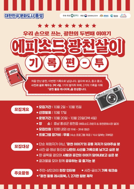 참가자들은 10월 20일부터 23일까지 3박 4일간 광천에 머물며 ▲주민·상인 인터뷰 ▲시장 골목 탐방 ▲사진·글 기록 워크숍 ▲공동 창작 활동 등에 참여해 단순한 ‘소비자’가 아니라 지역 이야기를 함께 써 내려가는 공동 저자로 활동하게 된다.
