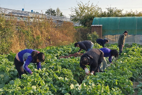 | ▲ "2025년 하반기 영농 드림팀 정착지원 교육(귀농귀촌 33기) 교육생들이 현장 텃밭 실습을 통해 정식부터 수확까지 전 과정을 직접 경험하며 배추와 무를 재배하는 모습 |