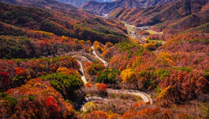 굽이마다 휘돌며 이어지는 길 위로 붉게 물든 숲이 드리워져, 한 폭의 수묵화처럼 운치를 자아낸다.