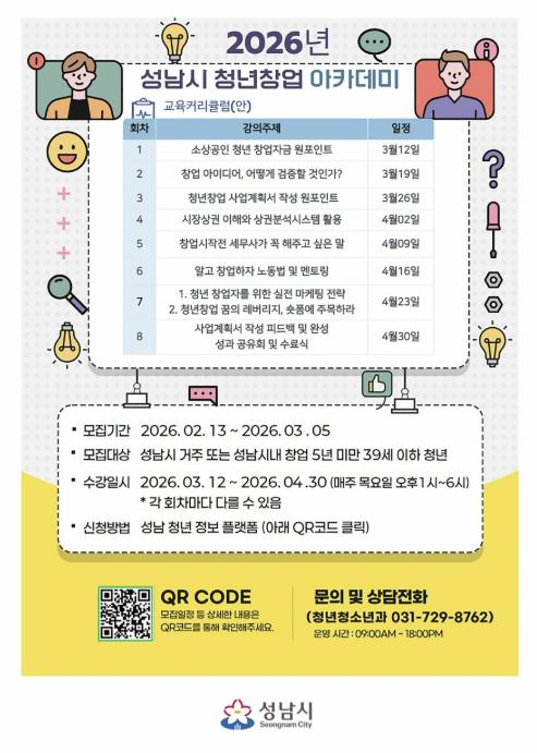 [파이낸셜경제=김기보 기자] 성남시는 오는 3월 5일까지 ‘청년창업 아카데미’ 무료 교육생 30명을 모집한다.