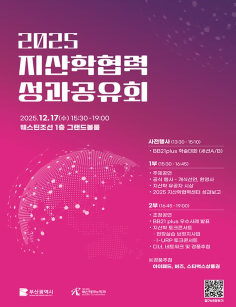 [파이낸셜경제=박영진 기자] 부산시는 오늘(17일) 오후 3시 30분 웨스틴조선호텔에서 '2025 지산학협력 성과공유회'를 개최한다고 밝혔다.