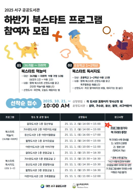 [파이낸셜경제=김영란 기자] 대전 서구 5개 공공도서관은 영유아의 올바른 독서 습관 형성을 위한 하반기‘북스타트 프로그램’을 운영한다고 14일 전했다.