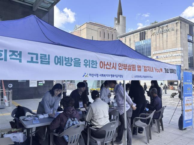 [파이낸셜경제=김영란 기자] 아산시는 24일 온양온천역 광장에서 순천향대학교 학술동아리 ‘PRerz’와 함께 복지사각지대 발굴과 고독사 예방을 위한 ‘아산시 안부살핌 앱 잘지내YOU 홍보캠페인’을 진행했다.