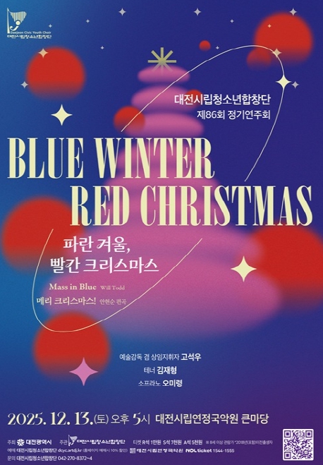 [파이낸셜경제=김영란 기자] 대전시립청소년합창단이 13일 오후 5시, 대전시립연정국악원 큰마당에서 제86회 정기연주회‘파란 겨울 빨간 크리스마스’(Blue Winter Red Christmas)를 무대에 올린다.