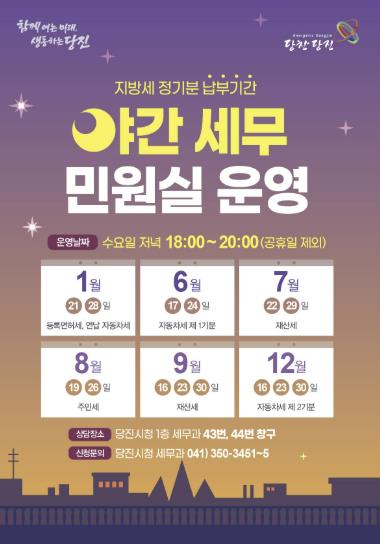 당진시 야간 세무민원실은 2025년 도내 최초로 운영을 시작해 올해로 2년째 운영하고 있다. 시는 지방세 정기분 납부 기간 중 매주 수요일 오후 6시부터 8시까지 2시간 동안 당진시청 1층 세무과 43번과 44번 창구에서 서비스를 운영하며, 전화 또는 방문을 통해 지방세 납부 및 각종 지방세 관련 문의·상담 등의 행정서비스를 제공하고 있다.