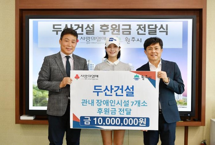 전달식은 원주시청에서 진행됐으며, 김문기 부시장과 두산건설 오세욱 상무, 두산건설We’ve 골프단 프로골퍼 박결 선수 등이 참석했다.