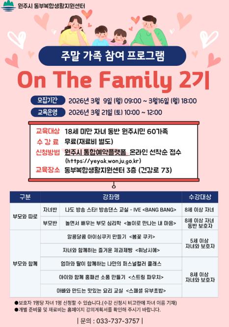 [파이낸셜경제=조성환 기자] 원주시 동부복합생활지원센터는 오는 21일 주말 가족 참여 프로그램 ‘온 더 패밀리(On The Family)’ 2기 과정을 운영한다.