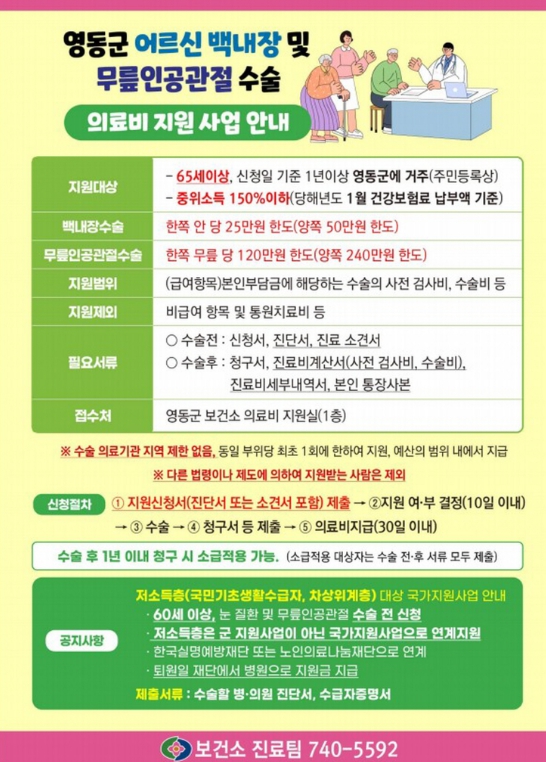 [파이낸셜경제=김기보 기자] 충북 영동군은 경제적 부담으로 수술을 미루는 지역 어르신들의 치료 기회를 높이기 위해 2026년에도 ‘백내장 및 무릎인공관절 수술 의료비 지원사업’을 지속 추진한다.