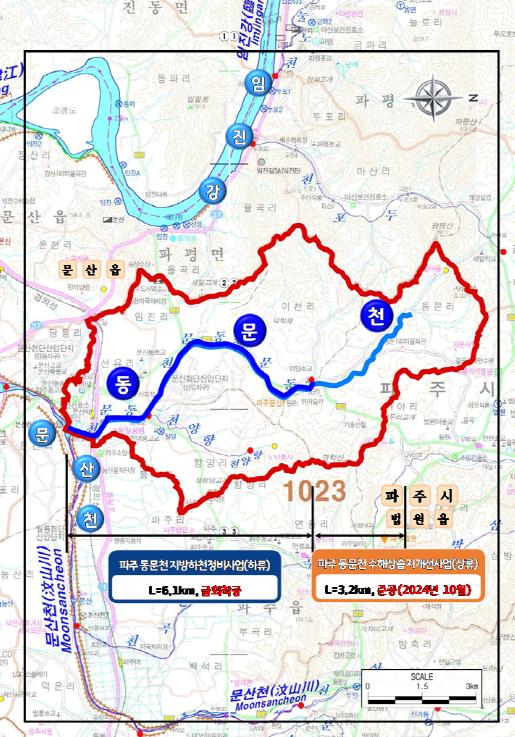정비사업은 파주시 문산읍 선유리에서 법원읍 동문리에 이르는 동문천 일원 총 연장 6.1km 구간의 하천을 정비하는 것으로 ▲축제공(제방 쌓기) 6.1km ▲보축(제방 보수·보강)2.4km ▲교량 5개소 설치 등이 포함된다.