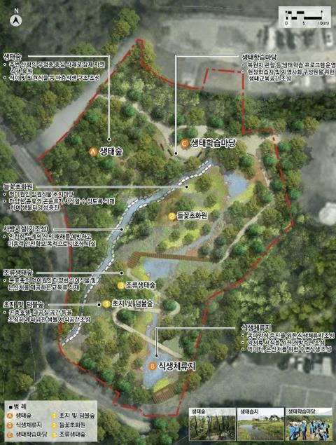 주요 시설은 초지 및 덤불숲, 조류생태숲, 들꽃초화원 등이 포함되며, 습지 조성과 전망대 등 자연 관찰과 학습이 가능한 공간으로 조성된다.