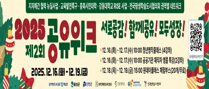 함수석 군 평생학습센터 주무관은 “이번 공유 위크는 진천군과 음성군이 함께 쌓아온 협력의 성과를 지역사회와 나누고자 마련했다”며 “앞으로도 지속가능한 협력적 거버넌스를 구축하고 공생하는 학습 공동체로 나아가기 위해 최선을 다하겠다”고 말했다.
