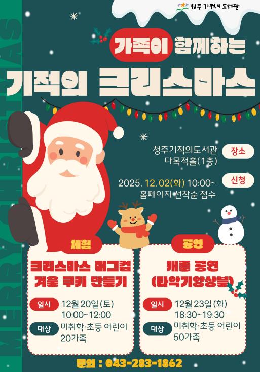 [파이낸셜경제=김기보 기자] 청주기적의도서관은 오는 12월 20일과 23일 청주기적의도서관 다목적홀(1층)에서 ‘가족이 함께하는 기적의 크리스마스’ 행사를 개최한다.