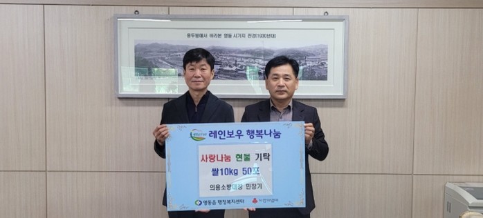 서우종 영동읍장은 “지역 주민을 위해 큰 나눔을 실천해 주셔서 진심으로 감사드린다”며 “기탁해 주신 쌀은 추운 겨울을 보내는 저소득 가정에 소중히 전달하겠다”고 밝혔다.