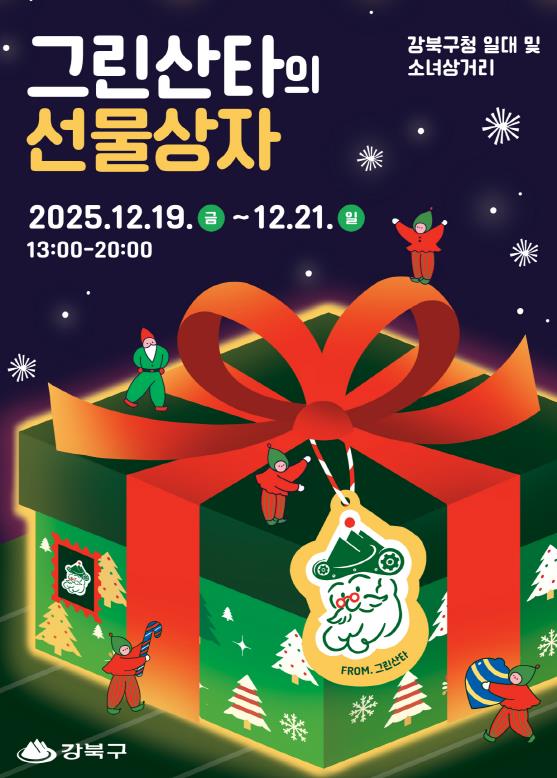 [파이낸셜경제=김예빈 기자] 서울 강북구는 오는 19일부터 21일까지 3일간 강북구청과 그 일대에서 2025 강북 크리스마스 마켓 ‘그린산타의 선물상자’를 개최한다고 밝혔다.