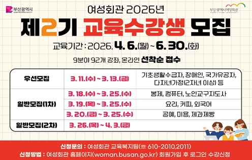 [파이낸셜경제=박영진 기자] 부산시 여성회관은 오는 3월 11일부터 '2026년 제2기 교육과정' 수강생을 모집한다고 밝혔다.