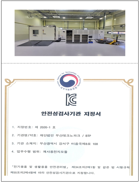 이번 자격 취득을 통해 (재)부산테크노파크는 'KC10031' 기준에 따른 사용후 배터리 안전성 검사를 공식 수행할 수 있게 됐다.
