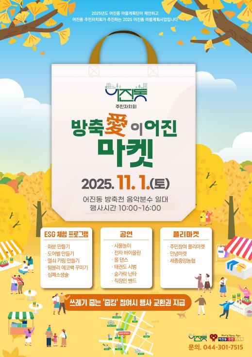 [파이낸셜경제=김영란 기자] 세종특별자치시 어진동이 내달 1일 오전 10시부터 오후 4시까지 방축천 음악분수 일원에서 어진동 주민자치회와 함께하는 ‘방축애(愛) 이어진마켓’을 개최한다.