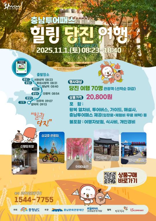 시 관계자는 “단풍이 물든 11월 당진의 아름다운 관광지에서 참가자들이 스트레스를 해소하고 재충전의 시간을 보내길 기대한다”며, “앞으로도 합덕역 활성화를 위한 다양한 관광상품을 선보일 것”이라고 전했다.