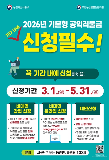 | ▲ 농업인 소득안정을 위한 기본형 공익직불금 신청 시작! |