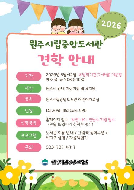 [파이낸셜경제=조성환 기자] 원주시립중앙도서관은 오는 3월부터 12월까지 관내 유치원과 어린이집을 대상으로 도서관 견학 프로그램을 운영한다.