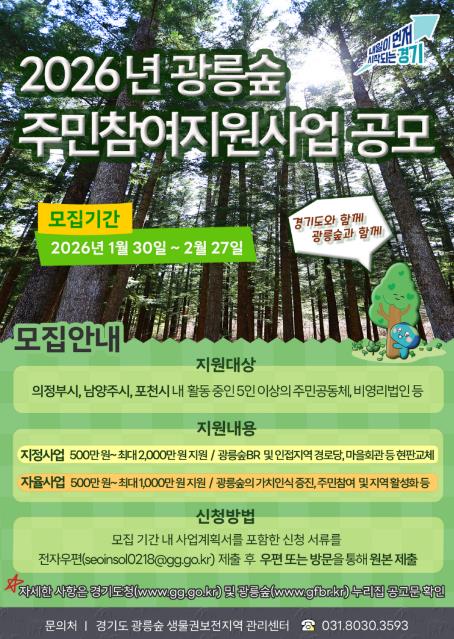 [파이낸셜경제=김영란 기자] 경기도가 광릉숲 생물권보전지역 활성화를 위해 2026년 광릉숲 주민참여지원사업 참여자를 모집한다.