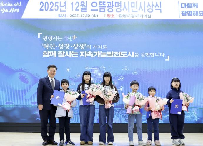 | ▲ 박승원 광명시장이 지난 30일 시청 대회의실에서 열린 '2025년 12월 으뜸광명시민시상식'에 참석해 ‘2025 광명시 독서마라톤 대회’ 5·10㎞코스 어린이 완주자들과 기념사진을 촬영하고 있다. |