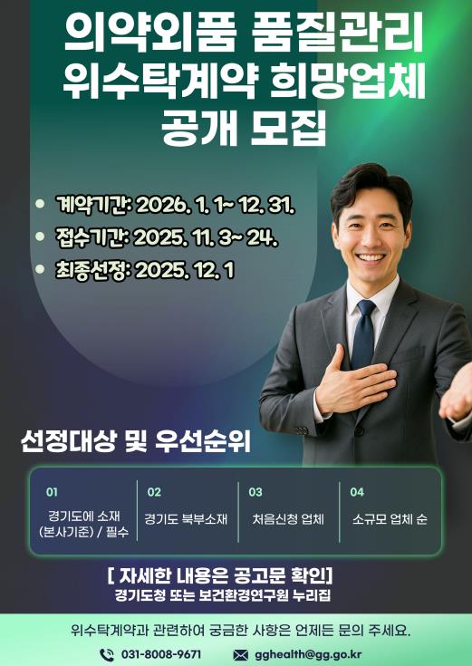[파이낸셜경제=김기보 기자] 경기도보건환경연구원은 오는 24일까지 ‘2026년 의약외품 품질검사 위·수탁계약’ 참여를 희망하는 제조·수입업체를 모집한다.
