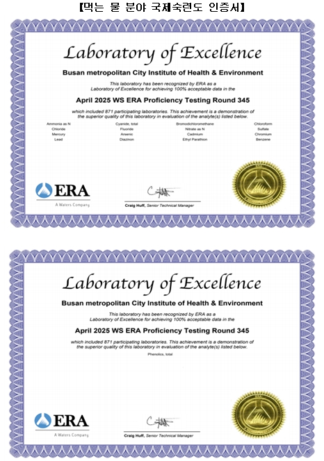 [파이낸셜경제=박영진 기자] 부산시 보건환경연구원은 먹는 물 분야 분석 능력 검증을 위해 참가한 미국 환경자원협회(ERA) 주관 국제숙련도 평가에서 전 항목 '만족' 판정을 받아 '최고 등급' 인증을 획득했다고 밝혔다.