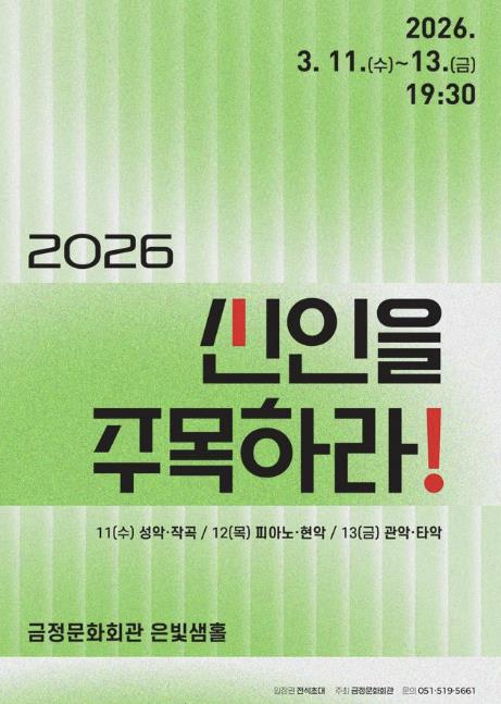 [파이낸셜경제=박영진 기자] 부산 금정구 금정문화회관은 3월 11일부터 13일까지 은빛샘홀에서 젊은 연주가 육성 시리즈인 '2026 신인을 주목하라!’를 개최한다.