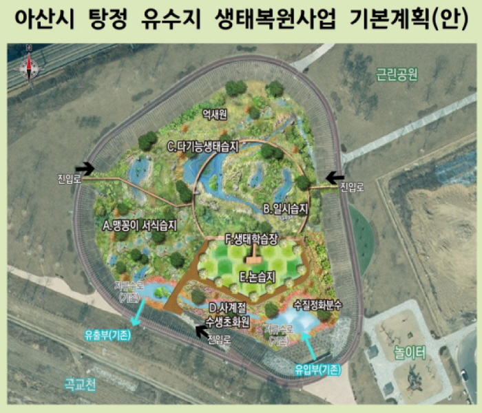 사업 대상지는 탕정지구 도시개발로 조성된 유수지다. 약 1만 4,492㎡의 전체 면적 중 8,700㎡가 생태복원 구역으로 편입된다.