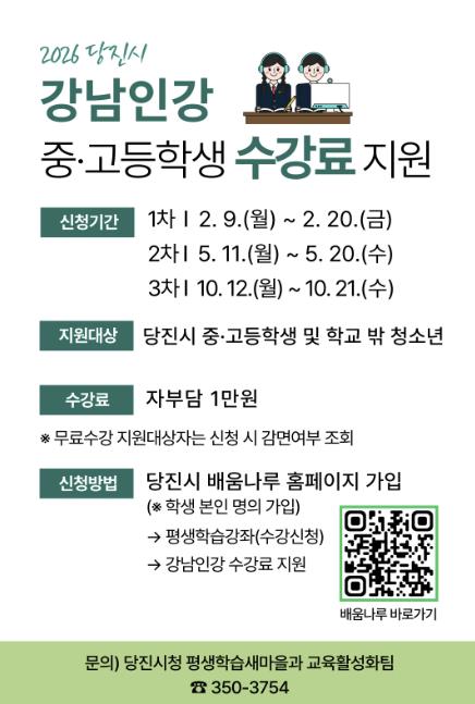 [파이낸셜경제=김영란 기자] 당진시는 사교육비로 인한 부모들의 경제적 부담 덜기 위해 당진시 중고등학생과 학교 밖 청소년을 대상으로 ‘강남인강’ 수강료를 지원한다고 6일 밝혔다.