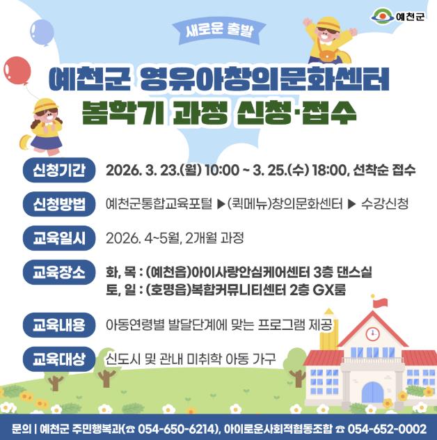 [파이낸셜경제=김지훈 기자] 예천군은 관내 영유아의 건강한 성장과 창의력 발달을 지원하기 위해 예천군 영유아 창의문화센터 봄학기 프로그램 수강생을 모집한다.