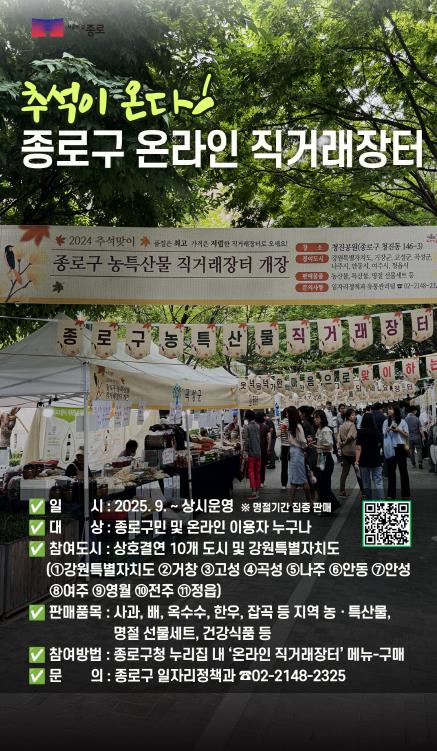 온라인 직거래 장터는 9월부터 상시 운영한다. 구청 누리집을 통해 접속하면 된다. 구와 상호결연을 맺은 거창군, 고성군, 곡성군, 나주시, 안동시, 안성시, 여주시, 영월군, 전주시, 정읍시 그리고 강원특별자치도 총 11개 도시의 대표 농·특산물과 명절 선물 세트, 건강식품을 합리적인 가격으로 선보인다.