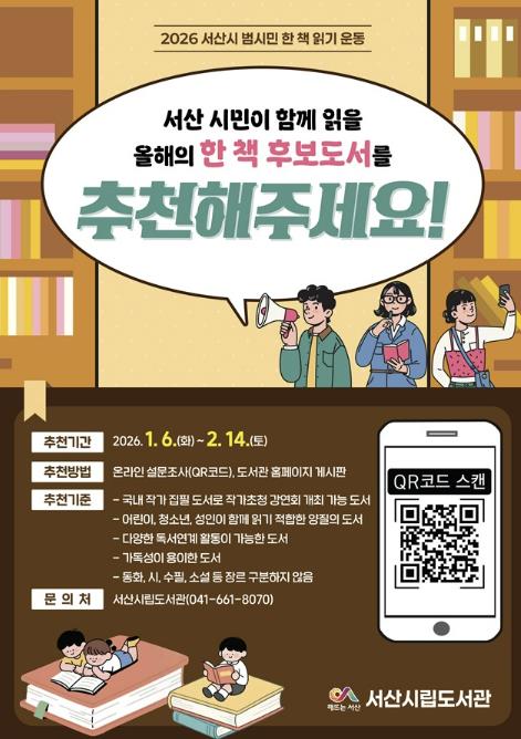 [파이낸셜경제=김영란 기자] 충남 서산시는 오는 1월 6일부터 2월 14일까지 2026년 범시민 한 책 읽기 운동의 후보 도서를 추천받는다고 밝혔다.