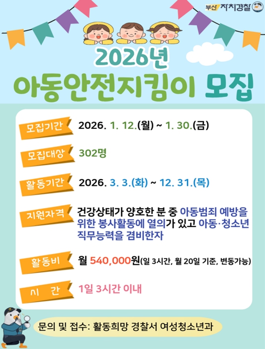 [파이낸셜경제=박영진 기자] 부산시 자치경찰위원회는 부산경찰청과 함께 오는 1월 12일부터 1월 30일까지 '2026년 아동안전지킴이'를 모집한다고 밝혔다.
