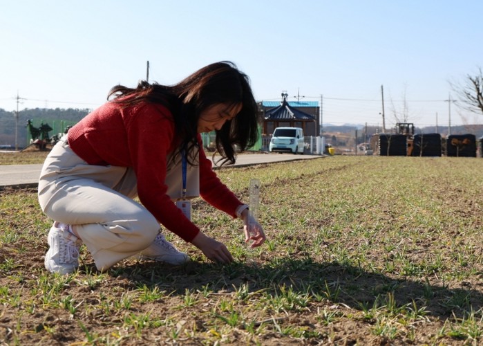 | ▲ '사진설명' 태안군농업기술센터 관계자가 맥류의 생육 상황을 점검하는 모습. |
