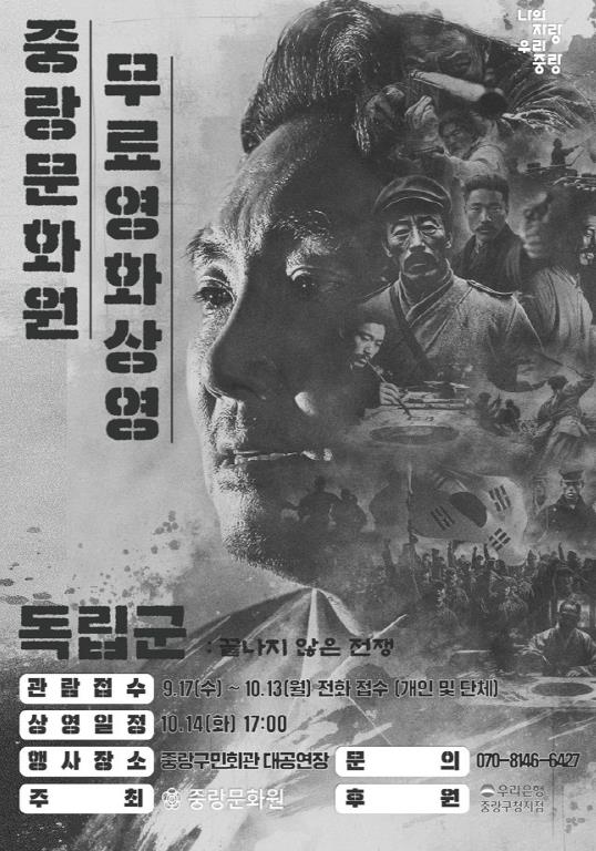 류경기 중랑구청장은 “광복 80주년을 맞아 열리는 이번 ‘독립군’ 상영 행사가 구민들에게 독립운동 정신을 되새기고 공동체의 의미를 다시금 깨닫게 하는 계기가 되기를 바란다”며, “앞으로도 구민과 함께 역사를 기억하고 계승할 수 있는 다양한 문화행사를 지속적으로 추진해 나가겠다”고 말했다.