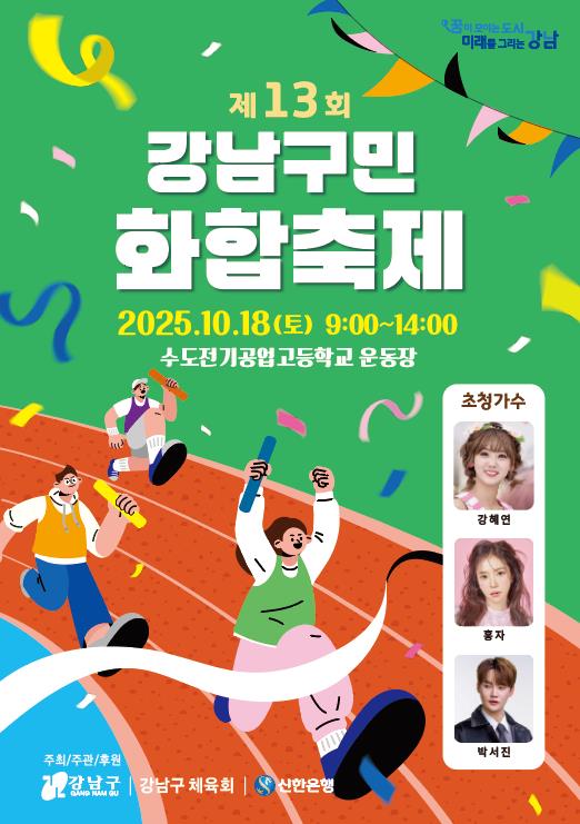 [파이낸셜경제=김예빈 기자] 꿈이 모이는 도시, 미래를 그리는 강남구가 오는 10월 18일 오전 9시부터 오후 2시까지 수도전기공업고등학교 운동장에서 ‘제13회 강남구민화합축제’를 개최한다. 구민과 선수단 등 약 7,500명이 참여할 예정이며, 소통과 화합을 바탕으로 건강한 지역사회를 만드는 의미 있는 자리가 될 것으로 기대된다.