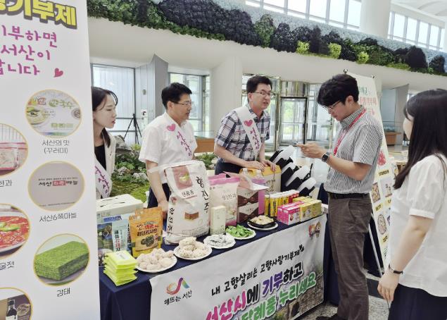 | ▲ 지난 7월 충남도청 로비에서 서산시 직원들이 고향사랑기부제를 홍보하는 모습 |