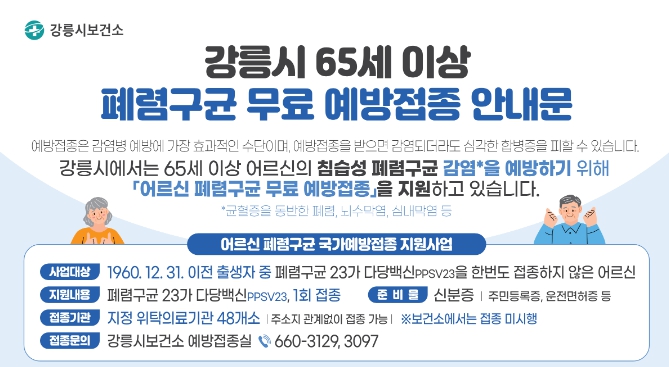 [파이낸셜경제=조성환 기자] 강릉시는 기온이 급격히 떨어지는 겨울철을 앞두고 면역력이 저하된 65세 이상 어르신들의 폐렴구균 예방접종률이 저조함에 따라, 중증 감염병 예방을 위한 시민들의 적극적인 접종 참여를 당부했다.