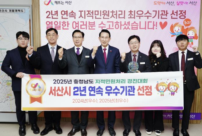 | ▲ 이완섭 서산시장, 관계 공무원들이 시청 시장실에서 충청남도가 주관한 2025년 지적 민원 처리 우수사례 경진대회에서 최우수기관에 선정된 것을 기념했다. |