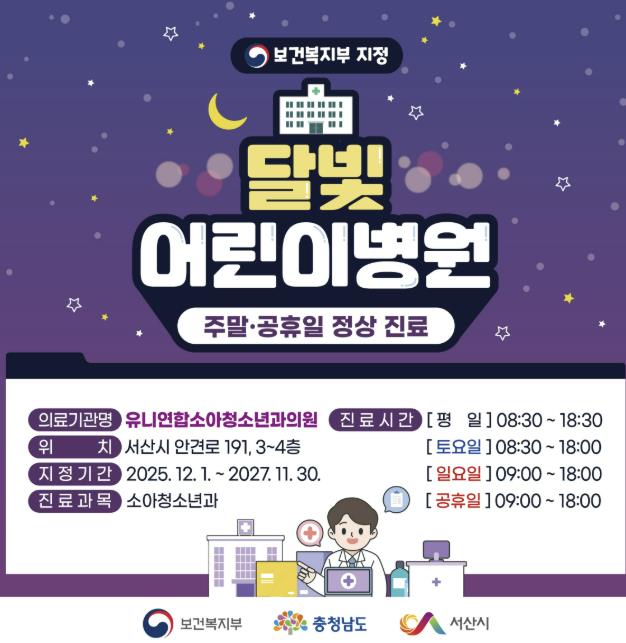[파이낸셜경제=김영란 기자] 충남 서산시는 동문동에 있는 유니연합소아청소년과의원이 관내 1호 달빛어린이병원으로 지정됐다고 밝혔다.