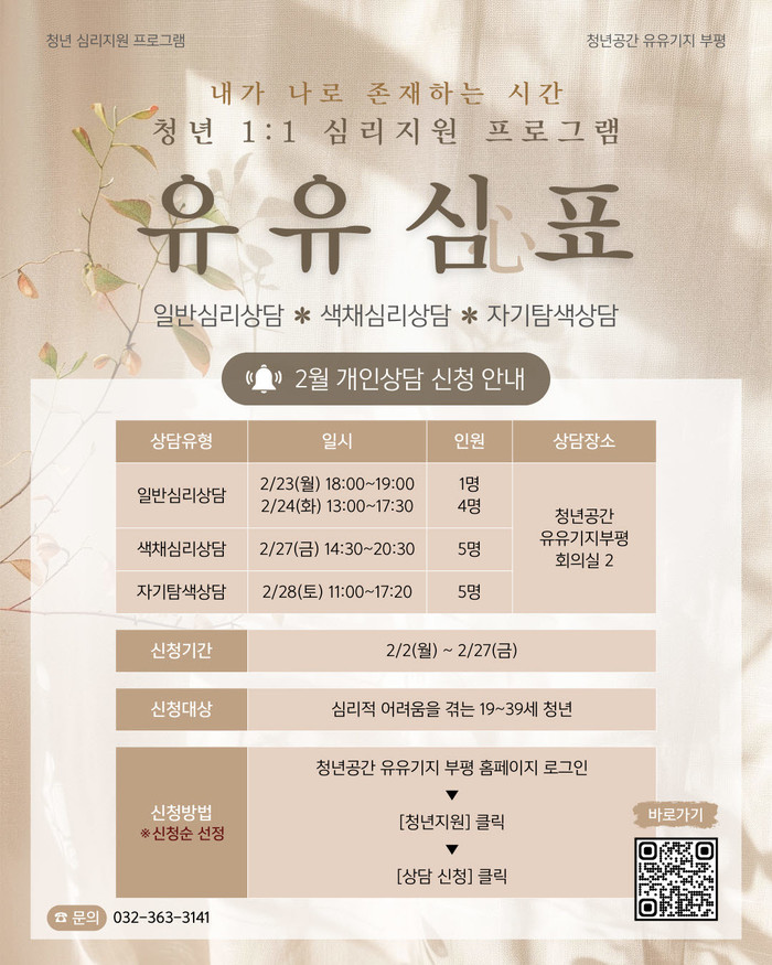 유유기지 부평 관계자는 “‘유유심(心)표’는 다양한 심리적 어려움을 겪는 청년들이 유형별 심리검사와 종합 상담을 통해 자신의 내면에 집중하고 정서적 연대감을 쌓을 수 있도록 돕는 프로그램”이라며, “전문 상담가와의 상담을 통해 청년들의 마음 건강에 긍정적인 변화가 이어지길 기대한다”고 말했다.
