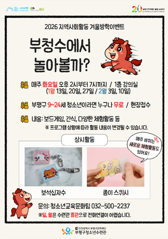 [파이낸셜경제=김기보 기자] 부평구 청소년수련관은 오는 20일부터 다음달 10일까지 겨울방학을 맞아 지역 청소년을 위한 2026 지역사회활동 겨울방학 이벤트 ‘부청수에서 놀아볼까’를 진행한다.