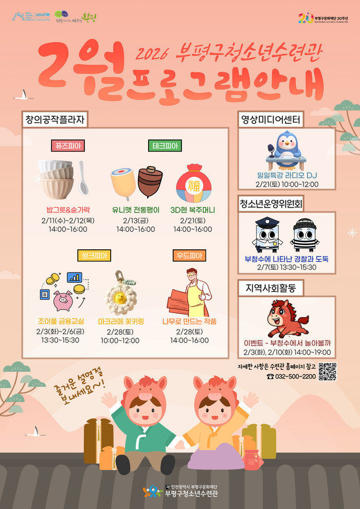 이 밖에도 겨울방학 동안 다양한 기획 프로그램이 진행될 예정이다. 자세한 사항은 부평구청소년수련관 누리집(portal.icbp.go.kr/bpy) 공지사항에서 확인하거나 카카오톡 플러스친구를 통해 안내받을 수 있다.
